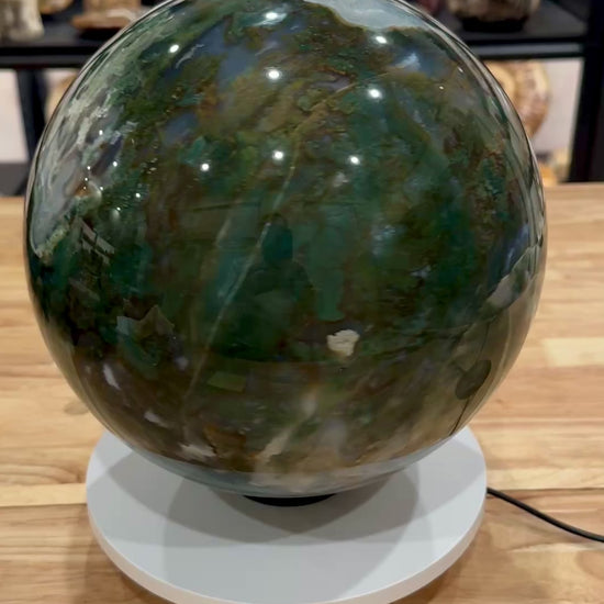 This 44.2 lb Ocean Jasper sphere is a breathtaking display of nature’s artistry. Measuring a massive 9.5 inches, it features a rare, seamless polish with no open vugs, offering a smooth and tactile experience. The surface is a rich tapestry of orbicular "eye" patterns and mossy green plumes that mimic the look of high-grade Moss Agate.
