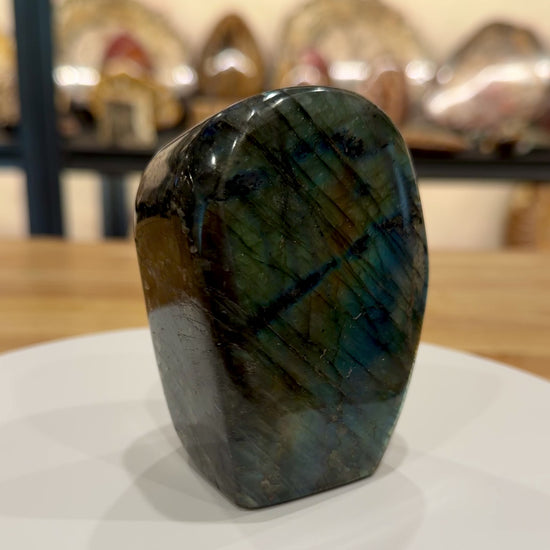 This Labradorite Table Accent, weighing 1.38 pounds and measuring 3.66" tall x 2.86" wide x 1.97" thick, showcases the stone’s unique iridescence and natural beauty. Labradorite is a feldspar mineral prized for its unique labradorescence, an optical phenomenon that produces vivid flashes of blue and green as light interacts with its internal structure. Originating from Labrador, Canada, it is also found in regions like Madagascar and Russia. Ideal for collectors and enthusiasts, it offers both aesthetic appeal and a tangible connection to geological history.